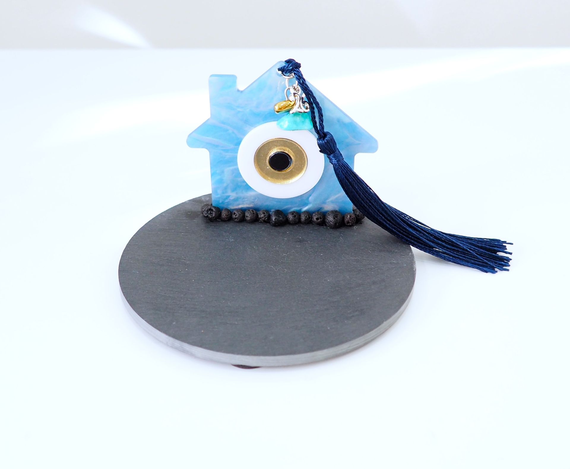 Γούρι 10cm. από Σχιστόλιθο στρογγυλό με πλεξιγκλάς Σπίτι, Τιρκουάζ, Αιματίτη χρυσό, Λάβα και φούντα. Παραλαβή από το κατάστημα Αγίας Παρασκευής 54 Χαλάνδρι, 2106832632