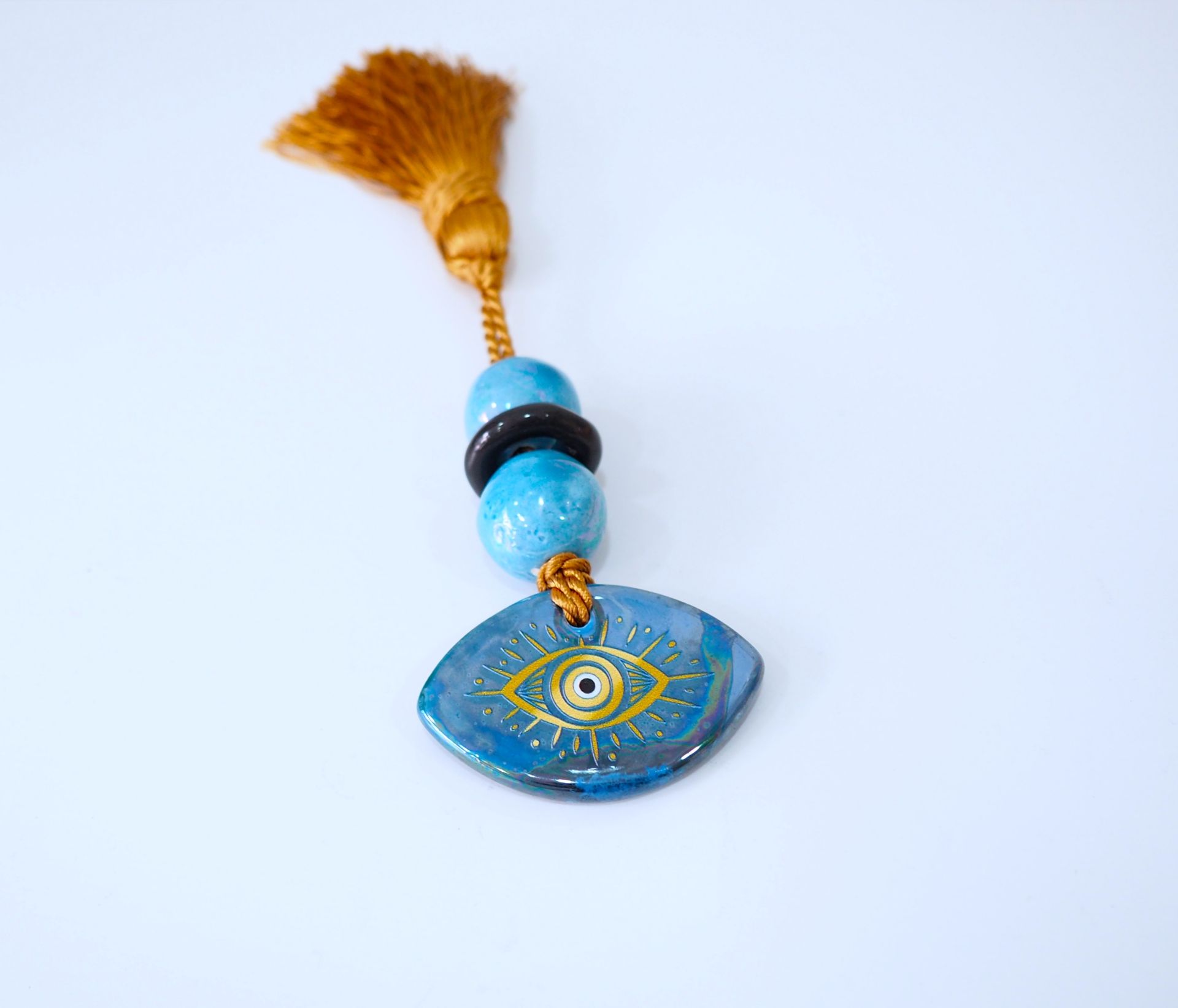 Γούρι από χρυσή φούντα κοντή, Κεραμικό μάτι και χάντρες