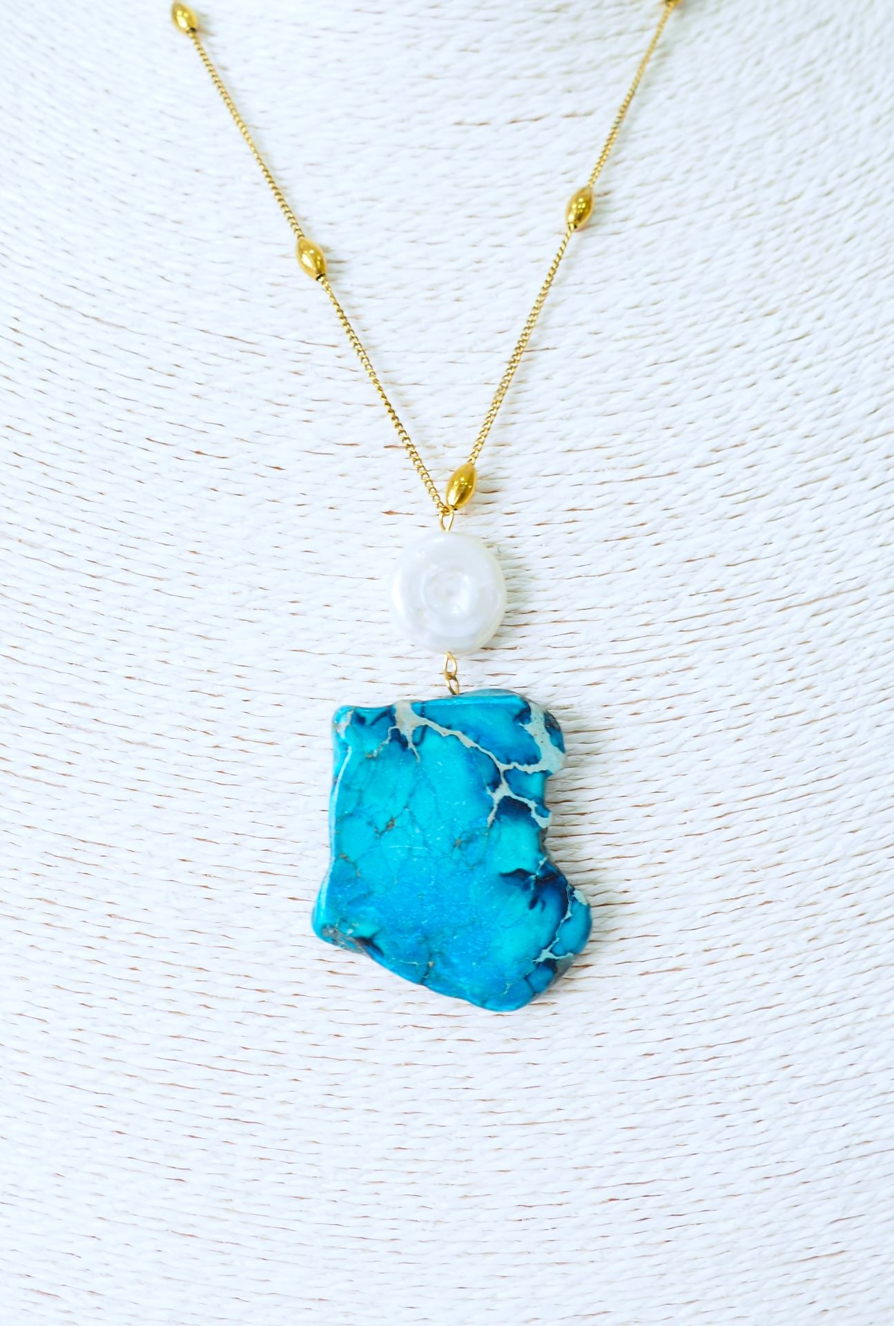 Κολιέ από Τιρκουάζ, Μαργαριτάρι, αλυσίδα ατσάλινη επίχρυση όπως και το κούμπωμα.