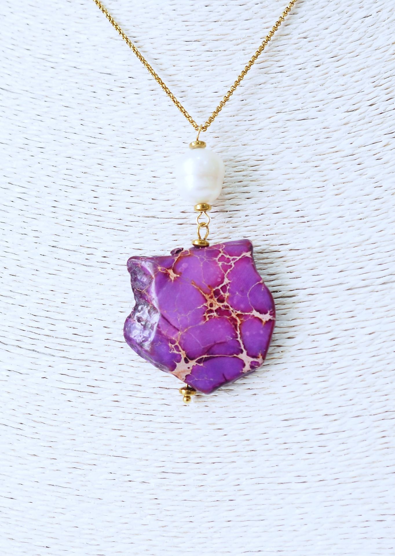 Κολιέ από Τιρκουάζ, Μαργαριτάρι, Αιματίτη χρυσό, αλυσίδα ατσάλινη επίχρυση όπως και το κούμπωμα.