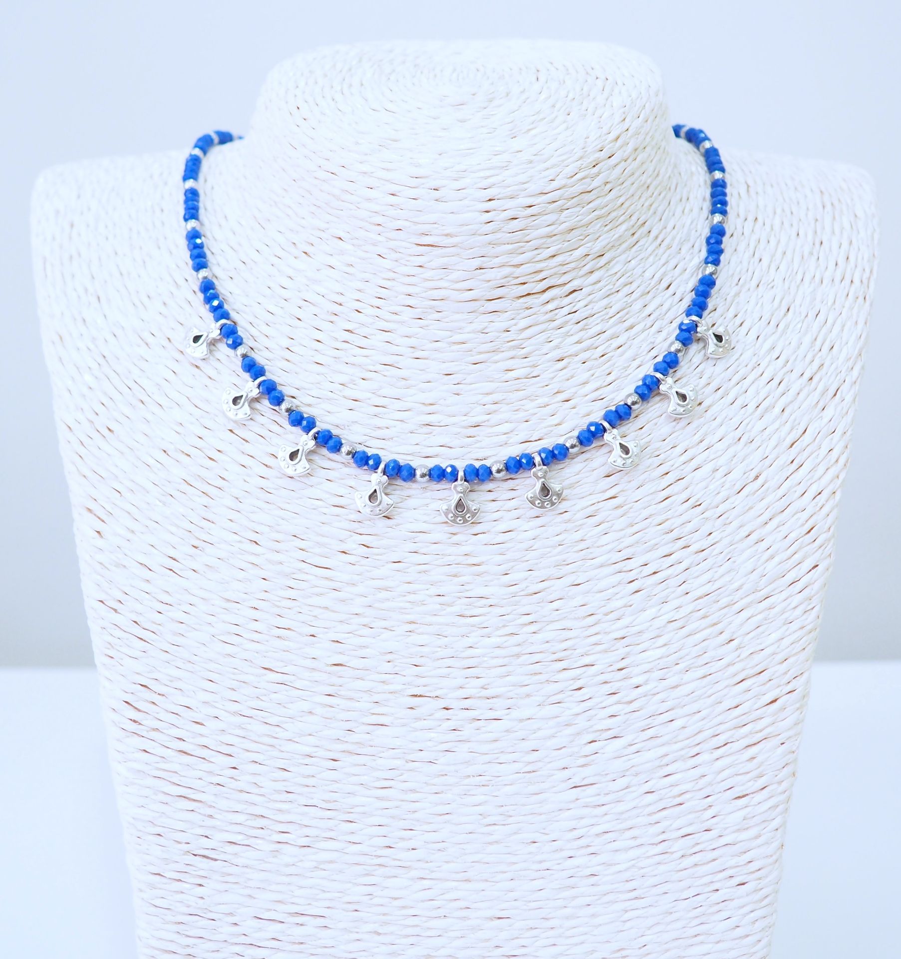 Κολιέ από επάργυρα boho στοιχεία (ζάμακ), Αιματίτη, κρυσταλλάκια μπλε και ατσάλινο κούμπωμα σε ατσαλόσυρμα.