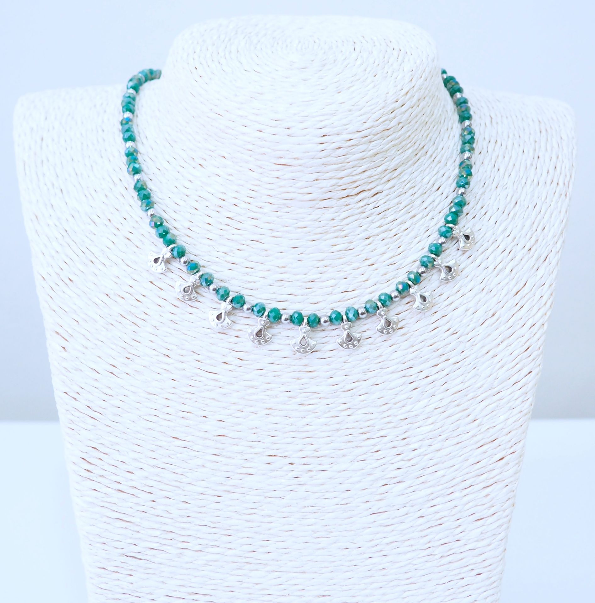 Κολιέ από επάργυρα boho στοιχεία (ζάμακ), Αιματίτη, κρυσταλλάκια πράσινα και ατσάλινο κούμπωμα σε ατσαλόσυρμα.