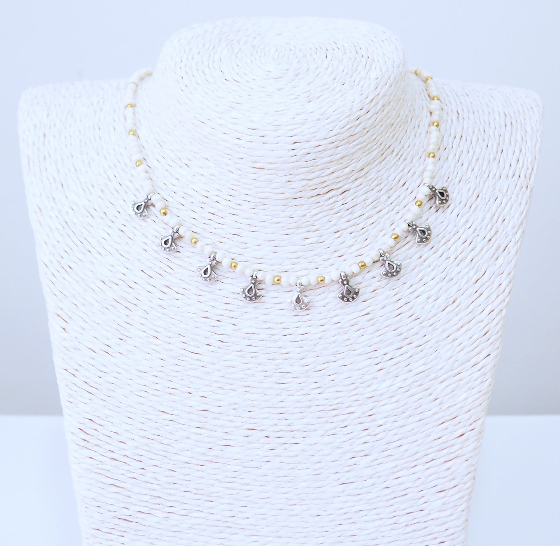Κολιέ από επάργυρα boho στοιχεία (ζάμακ), Αιματίτη χρυσό, Μαργαριτάρια και ατσάλινο επίχρυσο κούμπωμα σε ατσαλόσυρμα.