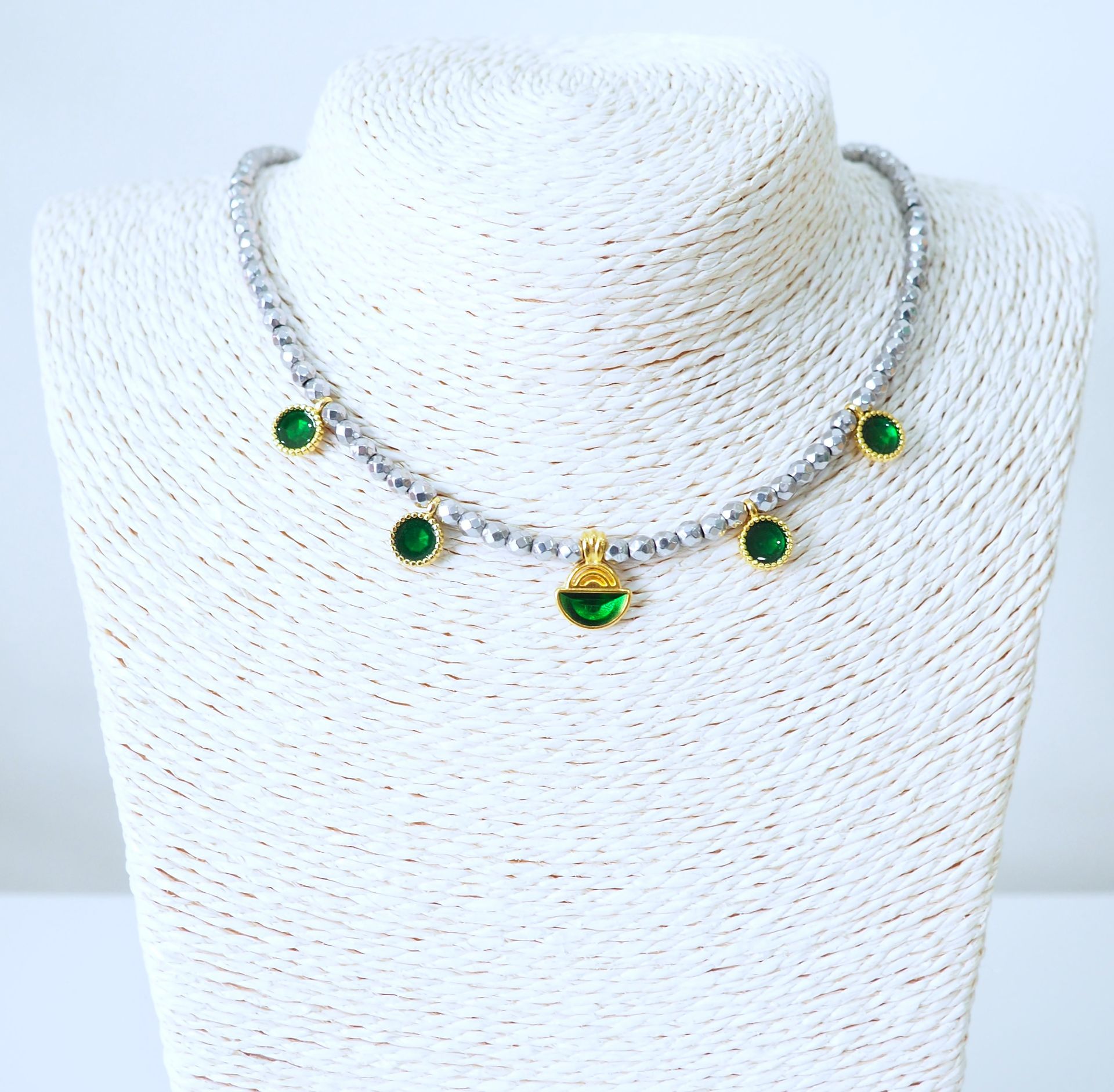 Κολιέ από επίχρυσα στοιχεία (ζάμακ) με πράσινο σμάλτο, Αιματίτη ασημί και ατσάλινο κούμπωμα σε ατσαλόσυρμα.