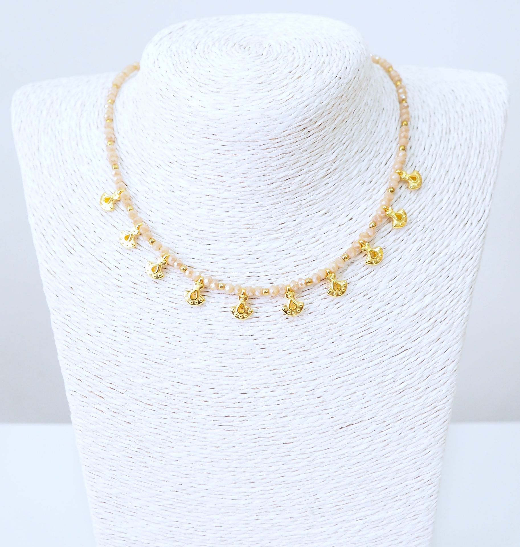 Κολιέ 42-47cm. (από άκρη σε άκρη) από επίχρυσα boho στοιχεία (ζάμακ), Αιματίτη χρυσό, κρυσταλλάκια caramel και ατσάλινο επίχρυσο κούμπωμα σε ατσαλόσυρμα. Ο Αιματίτης είναι ημιπολύτιμος λίθος και καλή ενεργειακά πέτρα με πολλές ιδιότητες ο οποίος προσφέρει πλούτο, ισορροπία, αισιοδοξία κ.α.