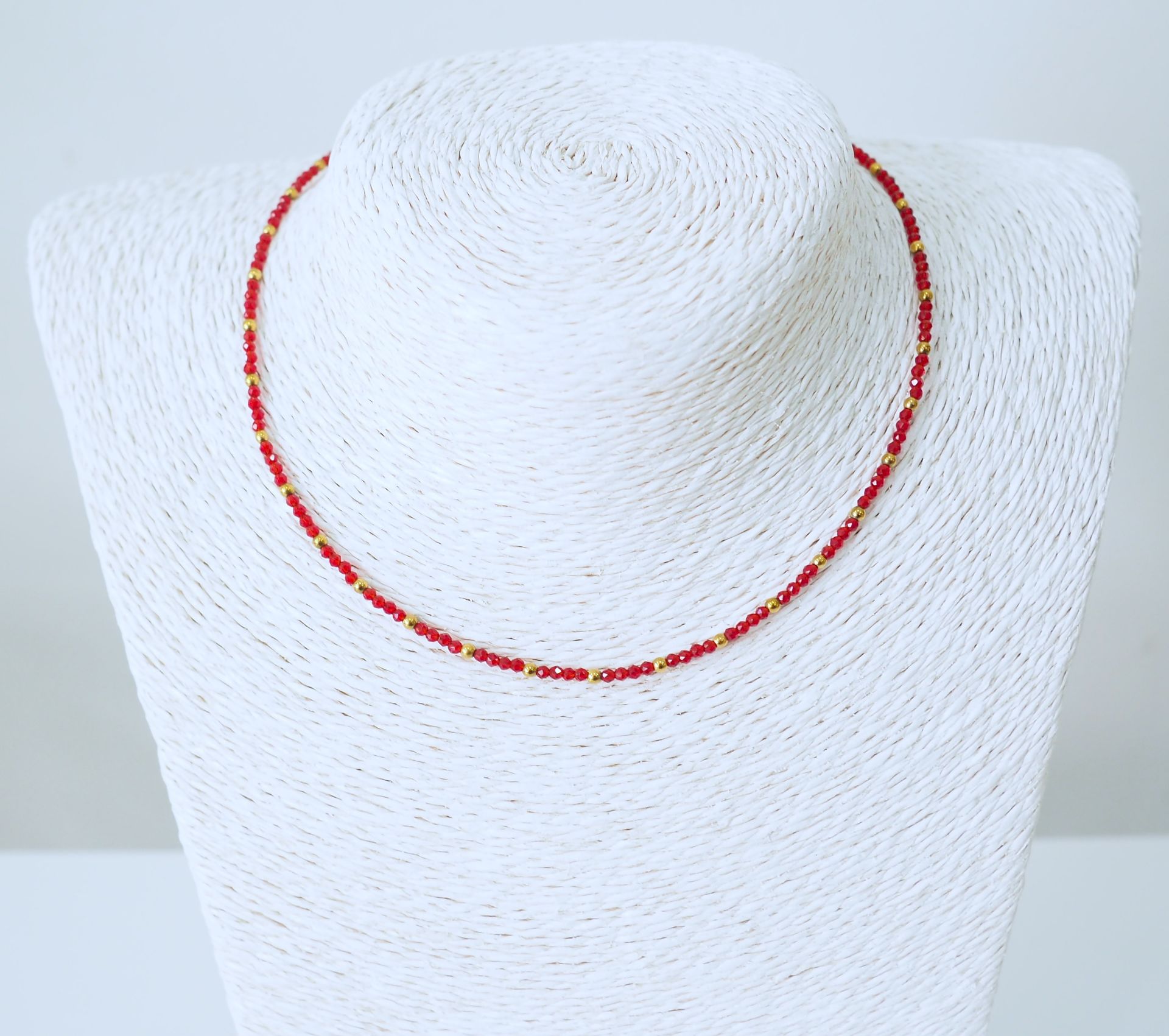 Κολιέ από Αιματίτη χρυσό, κρυσταλλάκια μπορντό και ατσάλινο επίχρυσο κούμπωμα σε ατσαλόσυρμα.