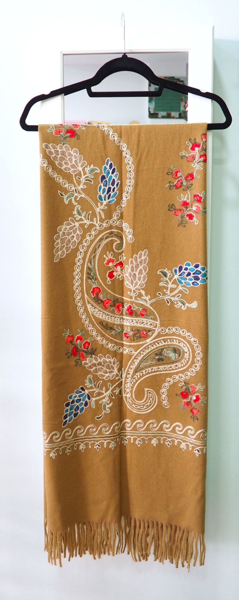 Πασμίνα καμηλό με κεντητά λαχούρια και πετρούλες