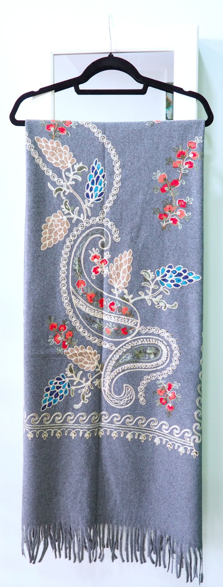 Πασμίνα κεντητή γκρι με λαχούρια και πετρούλες