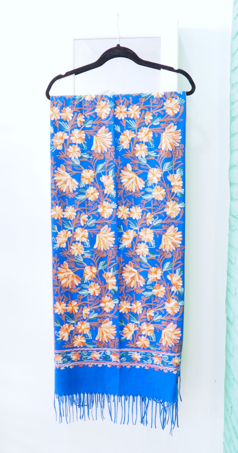 Πασμίνα κεντητή μπλε ανοιχτό με πορτοκαλί λουλούδια
