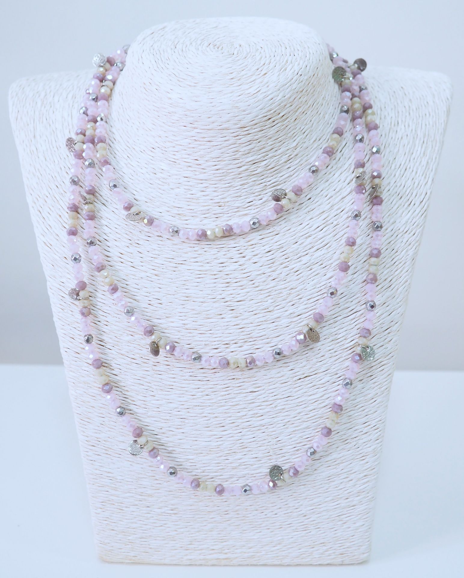 Κολιέ 1,32cm. (από άκρη σε άκρη) πολυμορφικό από Κρυσταλλάκια ροζ, μωβ, κρεμ, Αιματίτη και ατσάλινα φλουράκια - κούμπωμα. Φοριέται μονό, διπλό (το ένα κοντό και το άλλο μακρύ ή στην μέση), τριπλό και βραχιόλι εφταπλό. Ο Αιματίτης είναι ημιπολύτιμος λίθος και καλή ενεργειακά πέτρα με πολλές ιδιότητες ο οποίος προσφέρει πλούτο, ισορροπία, αισιοδοξία κ.α.