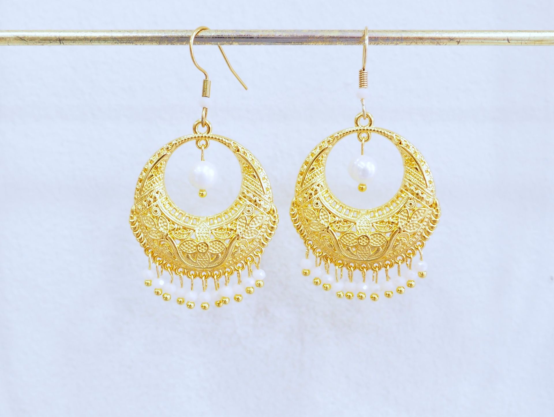 Σκουλαρίκια 5x3cm. από επίχρυσα στοιχεία (ζάμακ), λευκά κρυσταλλάκια, Μαργαριτάρια και ατσάλινα επίχρυσα γαντζάκια.