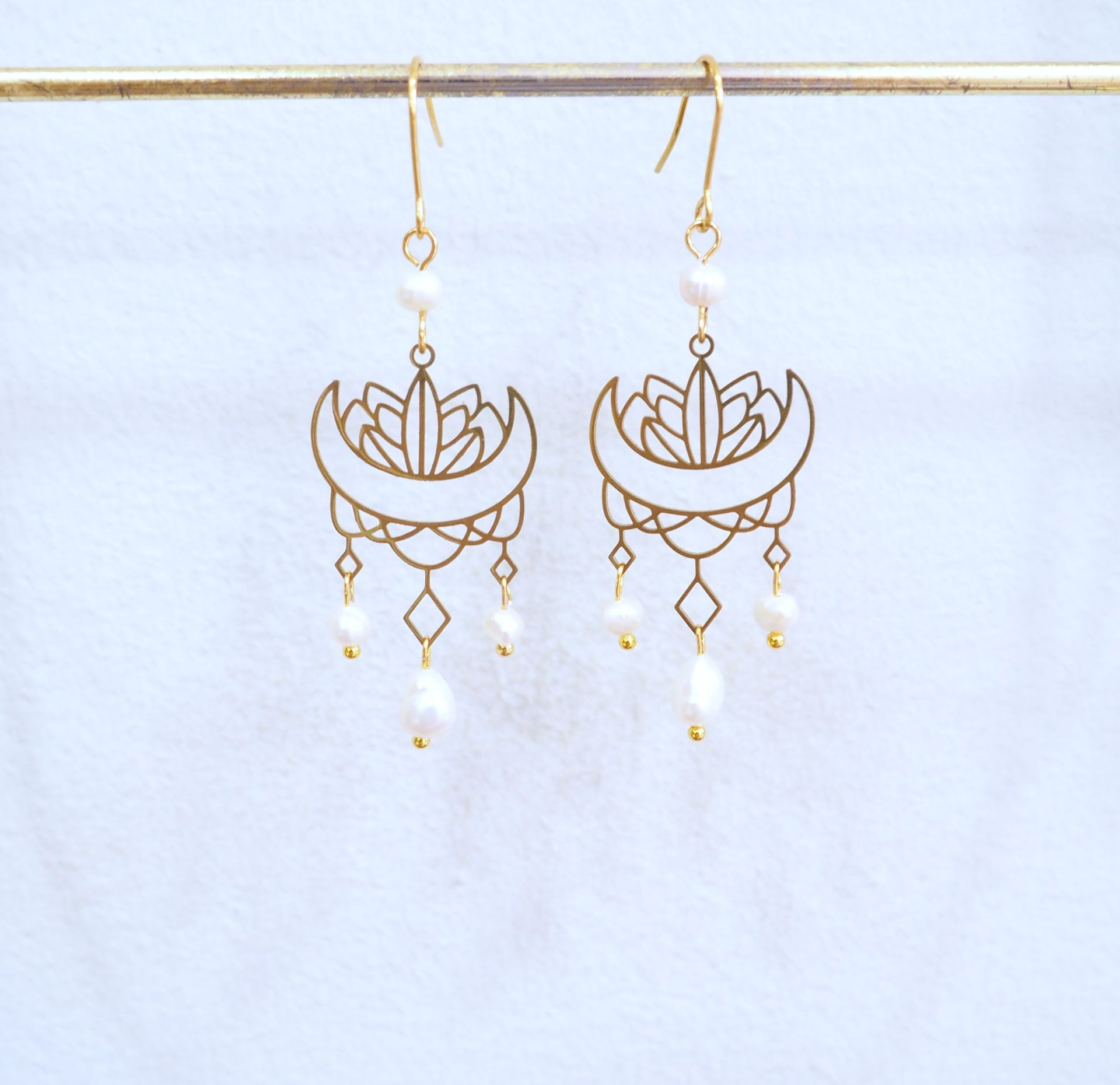 Σκουλαρίκια 6x2cm. ατσάλινο επίχρυσο νούφαρο με Μαργαριτάρια. Τα μαργαριτάρια είναι ημιπολύτιμοι λίθοι και καλές ενεργειακά πέτρες με πολλές ιδιότητες τα οποία προστατεύουν από συναισθηματικά τραύματα.