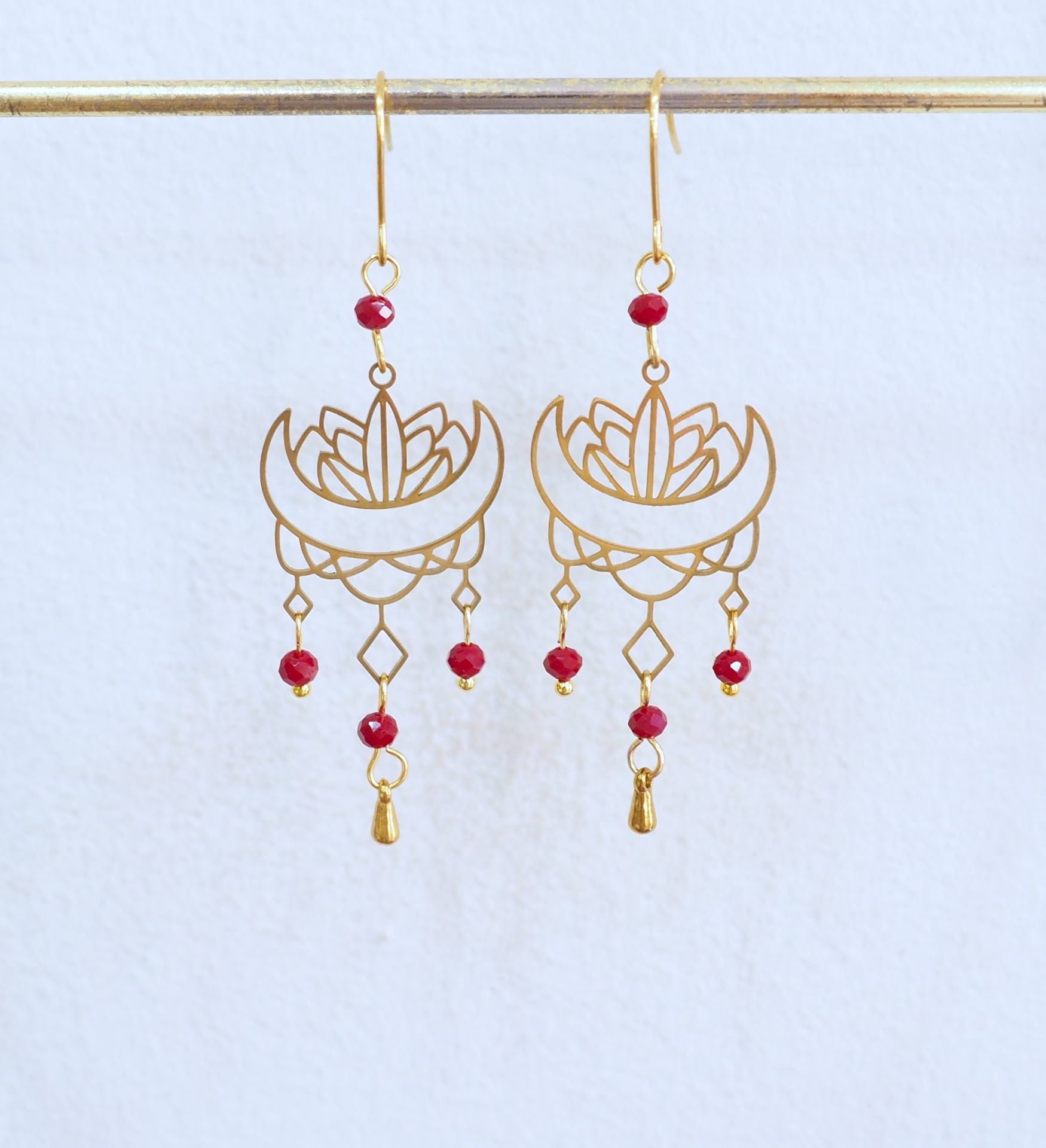 Σκουλαρίκια 6x2cm. ατσάλινο επίχρυσο νούφαρο με μπορντό κρυσταλλάκια.