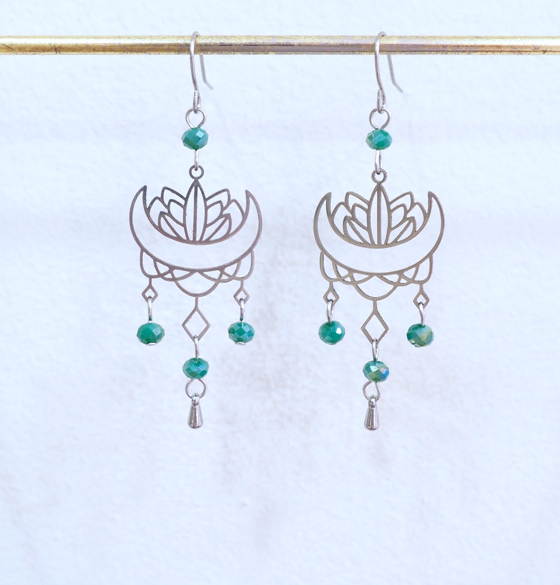 Σκουλαρίκια 6x2cm. ατσάλινο νούφαρο με κρυσταλλάκια πράσινα.
