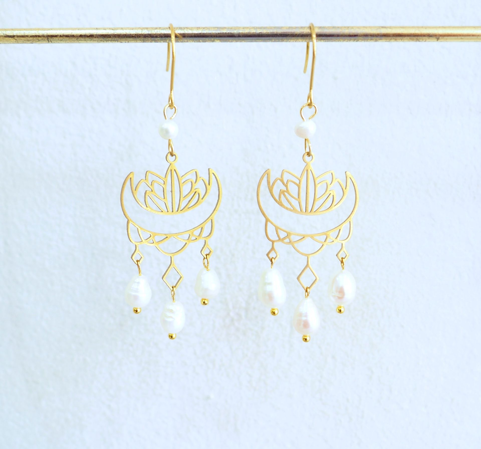 Σκουλαρίκια 6.5x2cm. ατσάλινο χρυσό νούφαρο με μαργαριτάρια. Τα μαργαριτάρια είναι ημιπολύτιμοι λίθοι και καλές ενεργειακά πέτρες με πολλές ιδιότητες τα οποία προστατεύουν από συναισθηματικά τραύματα.