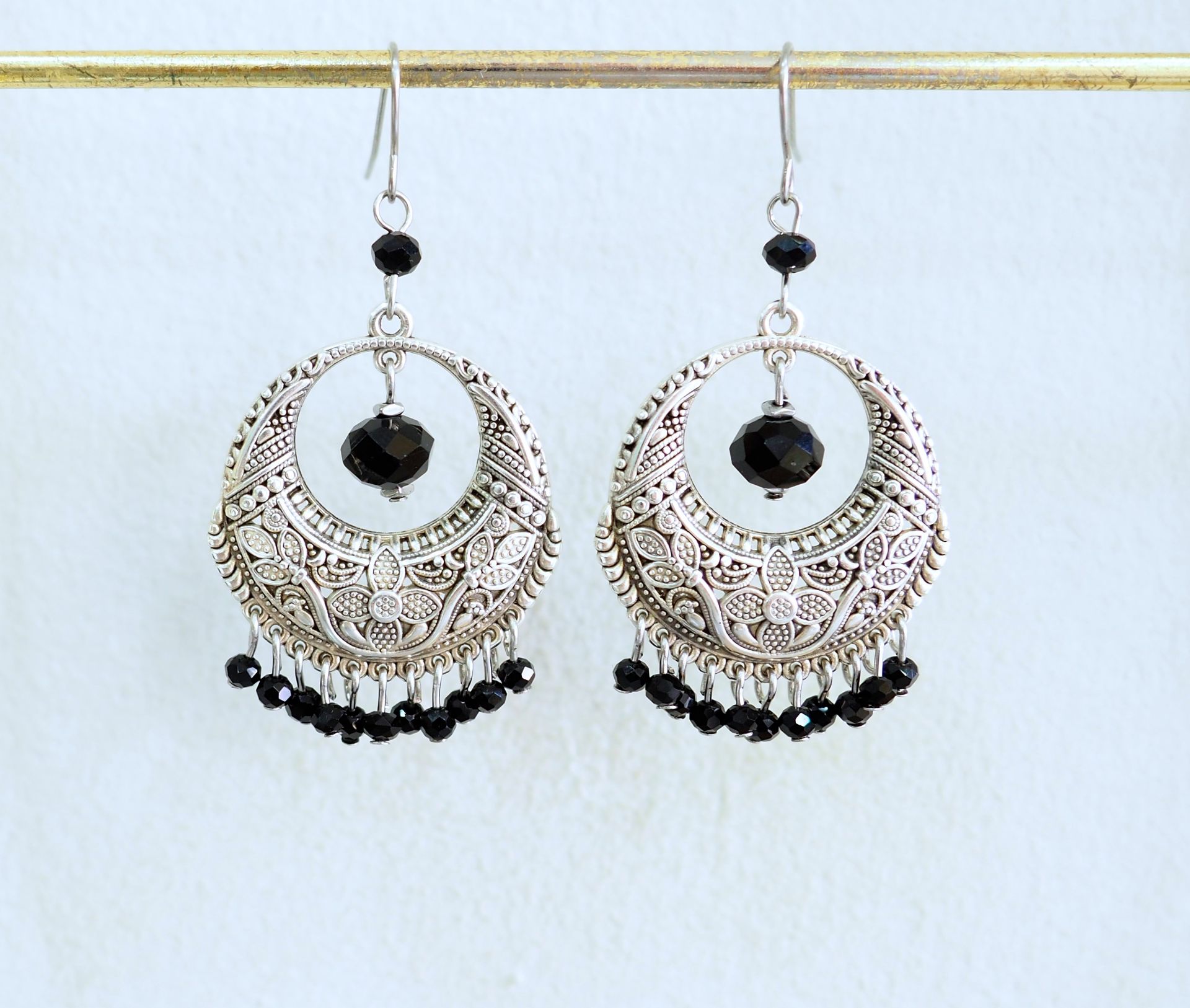 Σκουλαρίκια επάργυρα boho πολυέλεοί με κρυσταλλάκια μαύρα