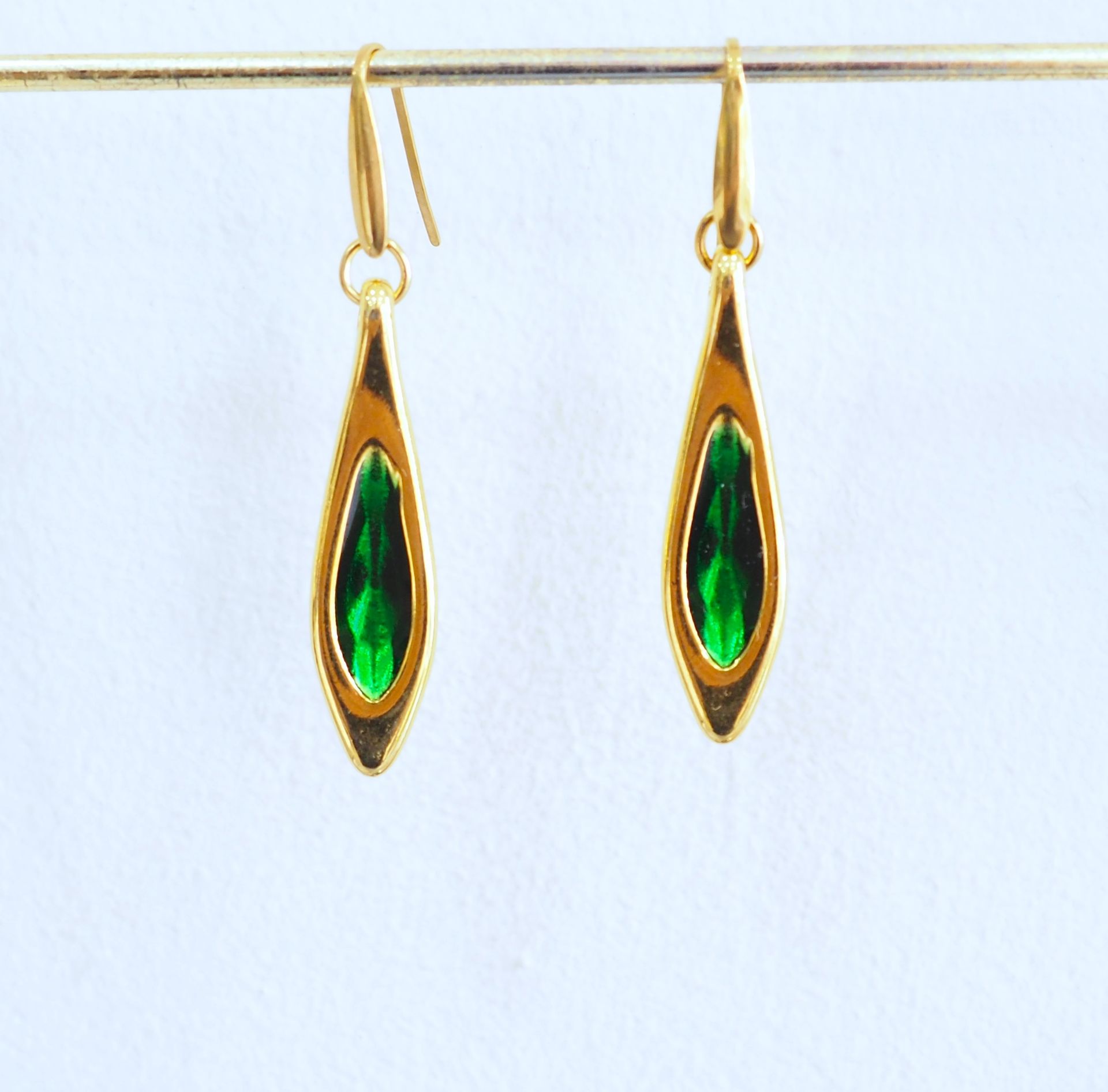 Σκουλαρίκια 5,5x1cm. από σταγόνα επίχρυσό ζάμακ, πράσινο σμάλτο και ατσάλινο επίχρυσό γατζάκι. Έχει και κολιέ Kl1075.
