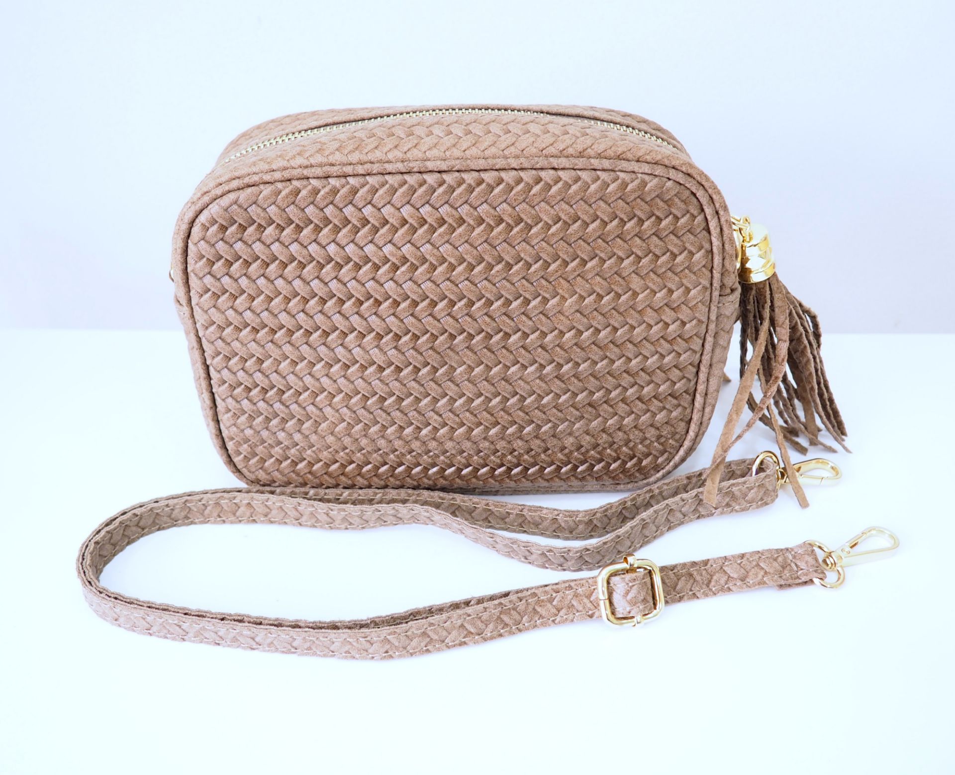 Τσάντα δερμάτινη 16-23cm. στο χρώμα του πούρου με υφή πλεξούδα.